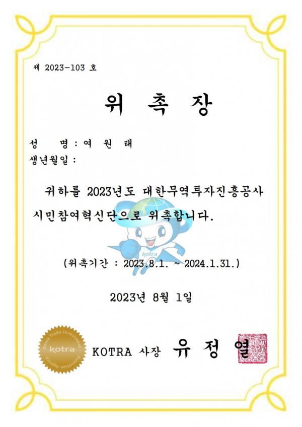 Letter of Appointment of KOTRA Citizen Participation Innovation Group 관련링크 mondereve 731 0 본문 Letter of Appointment of KOTRA Citizen Participation Innovation Group SHARE THIS PAGE 목록
